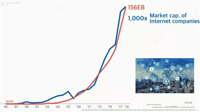 這是全球網(wǎng)絡(luò)的流量,橫坐標(biāo)是年份。紅色的線代表流量。從最早的1995年到2018年,網(wǎng)絡(luò)的流量,增加了100萬倍。我們?cè)賮砜戳硪粭l藍(lán)色的線。藍(lán)色的線,表現(xiàn)的是23年來全球互聯(lián)網(wǎng)公司的市場(chǎng)價(jià)值(市值)。